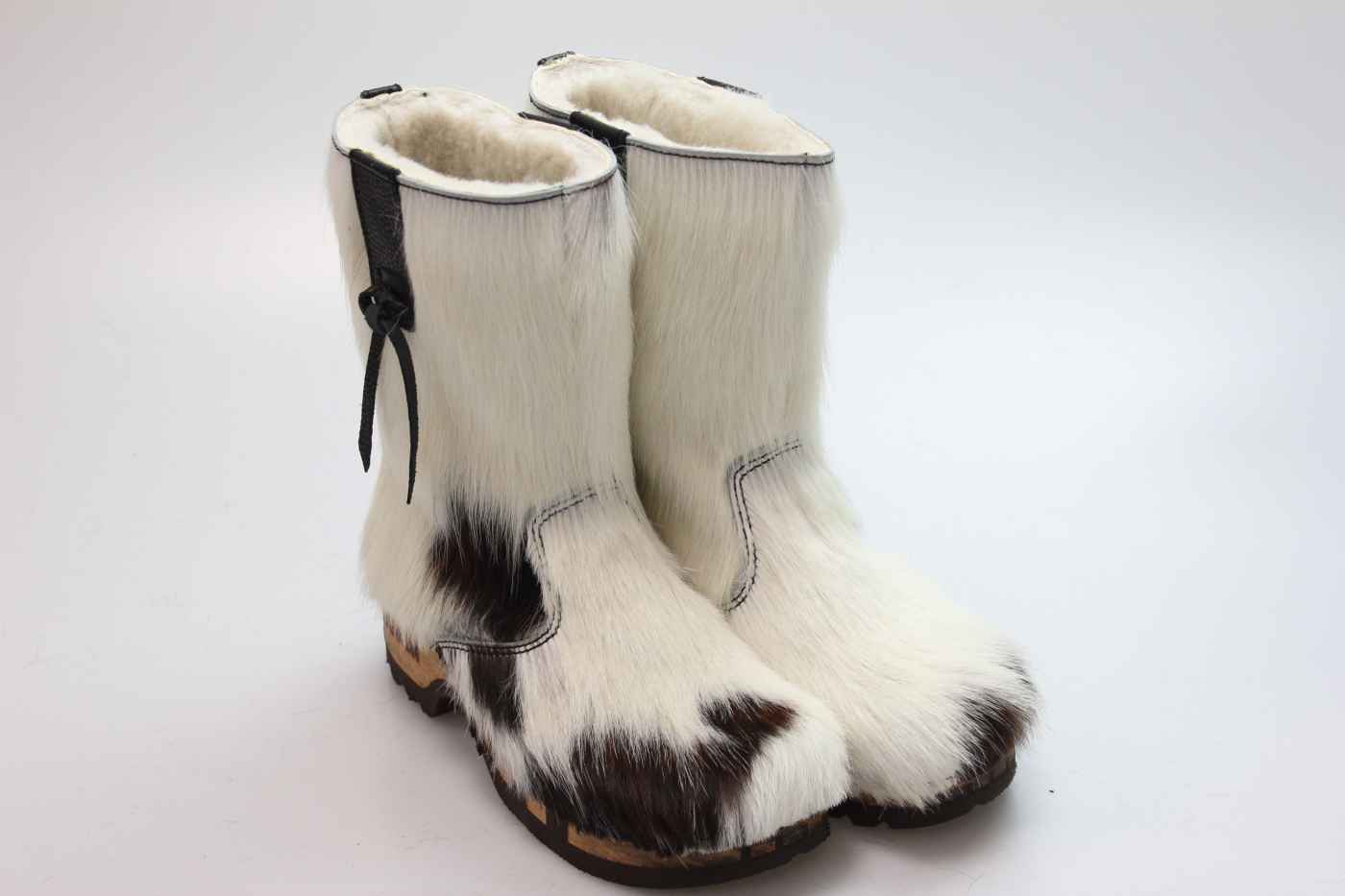 Bequemer Schlüpfstiefel aus Rindfell, mit beweglicher Holzsohle. Die Innenseite ist mit hochwertigem, echtem Schaffell verarbeitet.