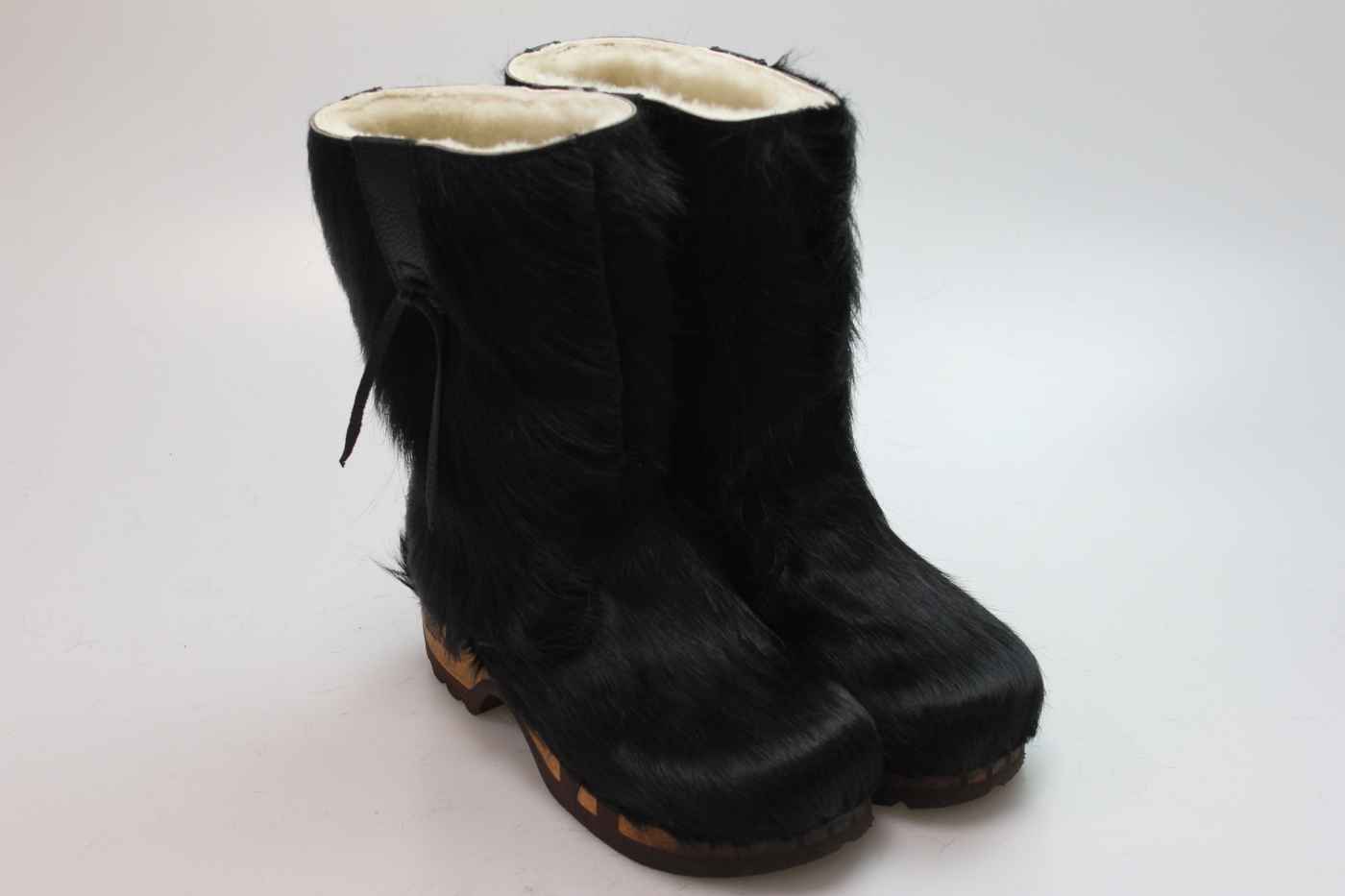 Bequemer Schlüpfstiefel aus Rindfell, mit beweglicher Holzsohle. Die Innenseite ist mit hochwertigem, echtem Schaffell verarbeitet.