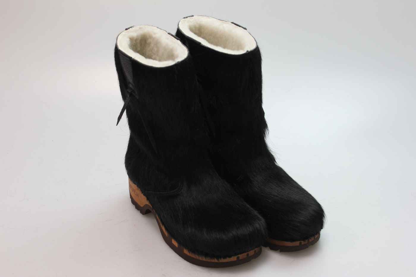 Bequemer Schlüpfstiefel aus Rindfell, mit beweglicher Holzsohle. Die Innenseite ist mit hochwertigem, echtem Schaffell verarbeitet.