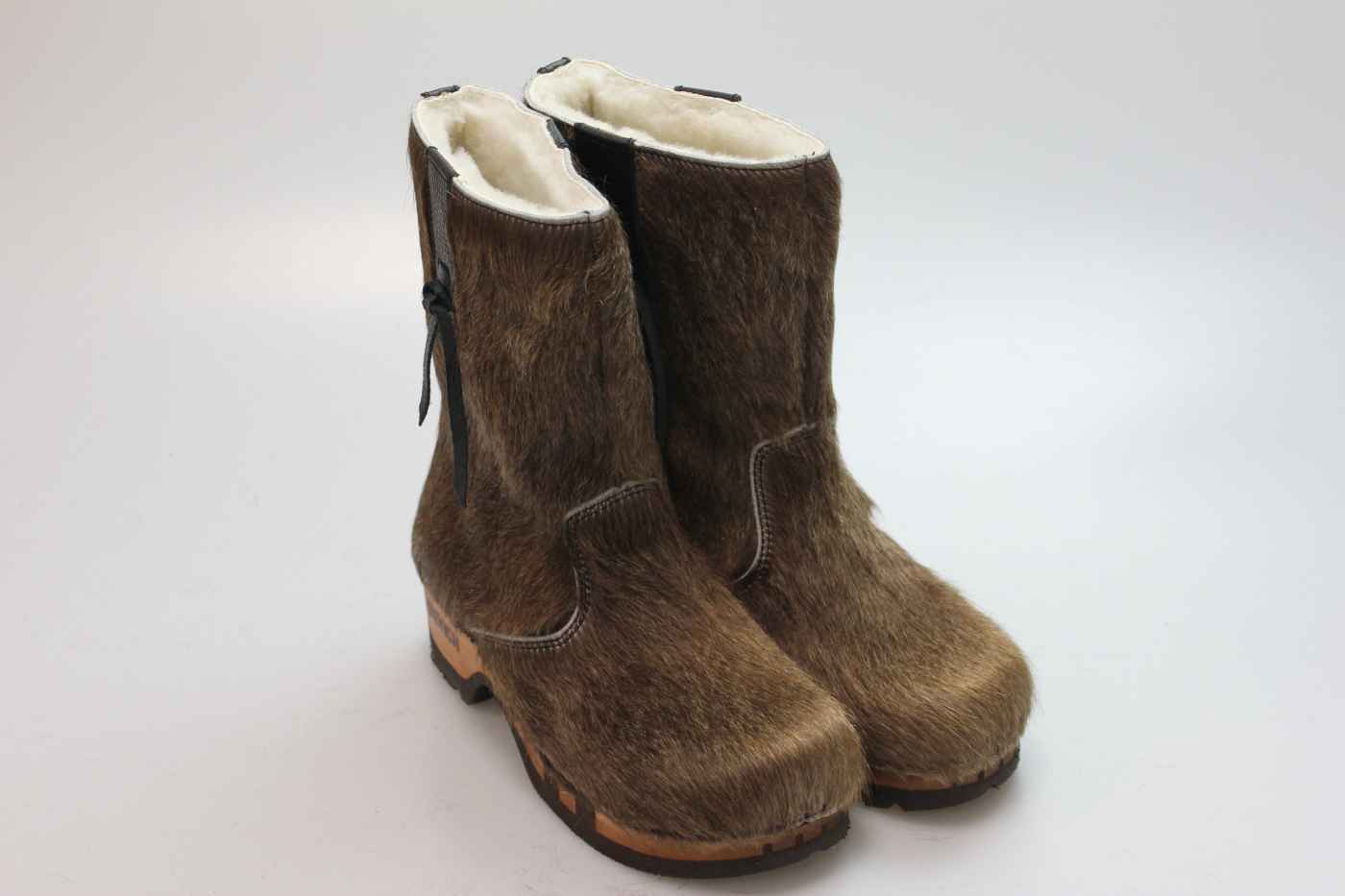 Bequemer Schlüpfstiefel aus Rindfell, mit beweglicher Holzsohle. Die Innenseite ist mit hochwertigem, echtem Schaffell verarbeitet.