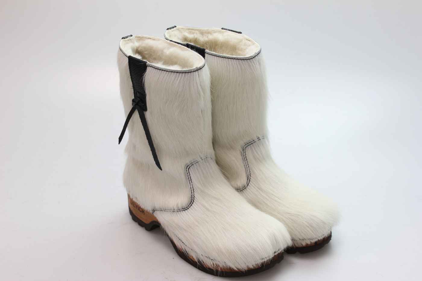 Bequemer Schlüpfstiefel aus Rindfell, mit beweglicher Holzsohle. Die Innenseite ist mit hochwertigem, echtem Schaffell verarbeitet.