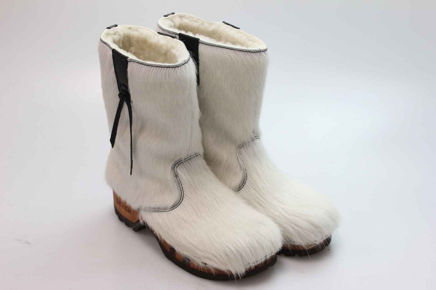 Bequemer Schlüpfstiefel aus Rindfell, mit beweglicher Holzsohle. Die Innenseite ist mit hochwertigem, echtem Schaffell verarbeitet.