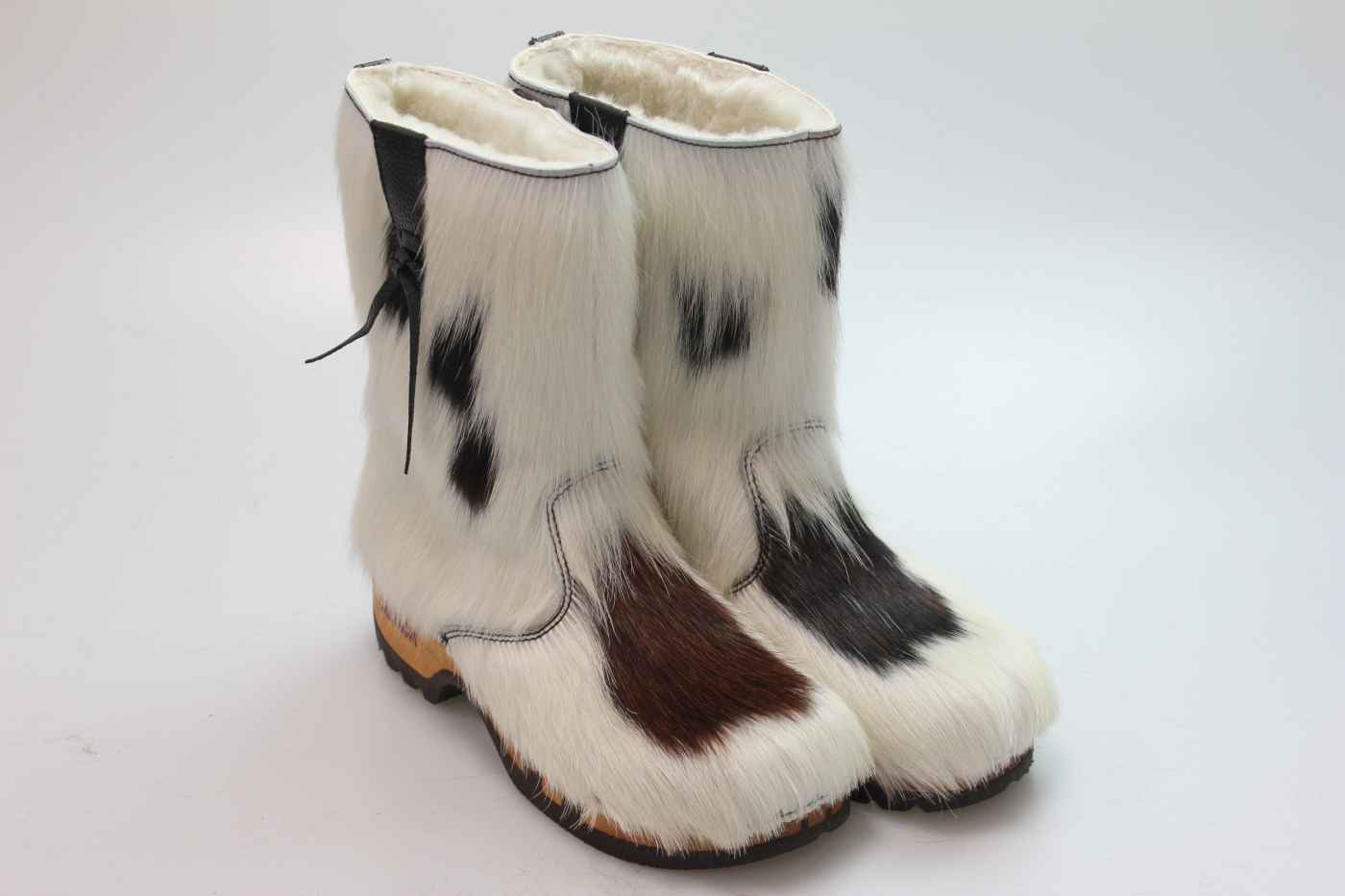 Bequemer Schlüpfstiefel aus Rindfell, mit beweglicher Holzsohle. Die Innenseite ist mit hochwertigem, echtem Schaffell verarbeitet.