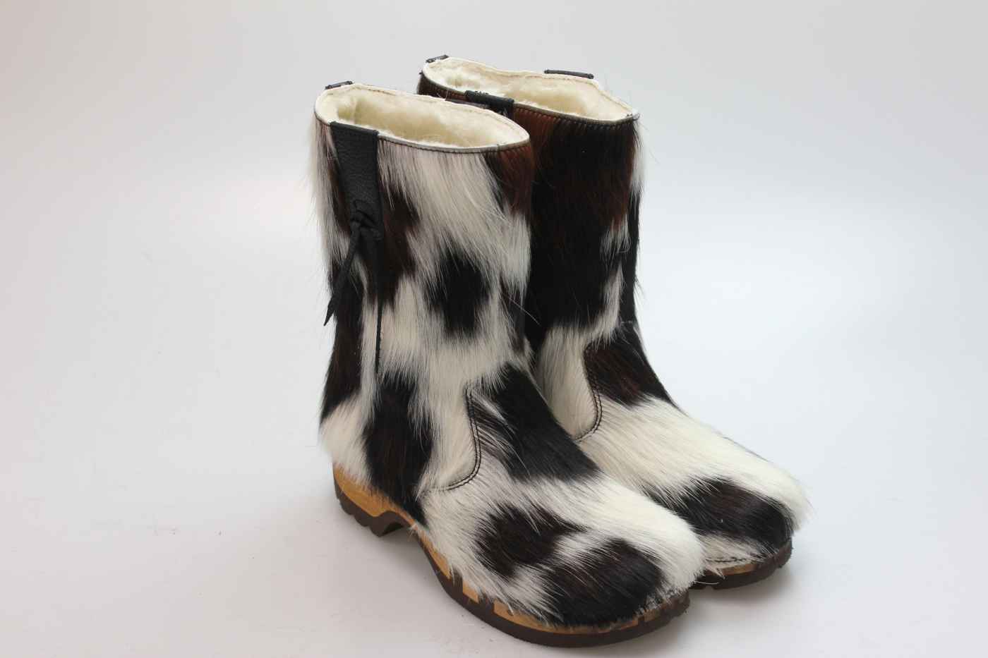Bequemer Schlüpfstiefel aus Rindfell, mit beweglicher Holzsohle. Die Innenseite ist mit hochwertigem, echtem Schaffell verarbeitet.