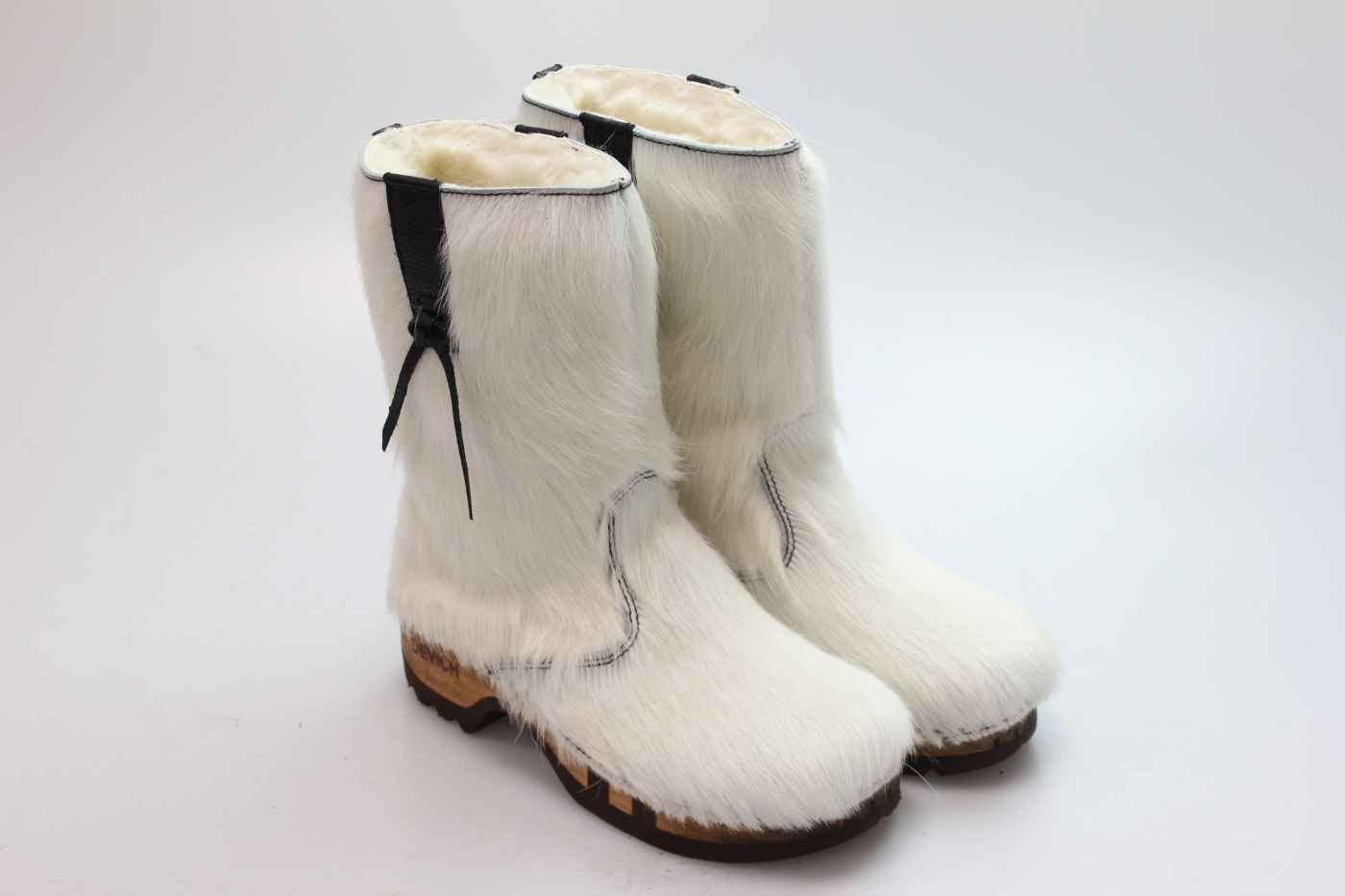 Bequemer Schlüpfstiefel aus Rindfell, mit beweglicher Holzsohle. Die Innenseite ist mit hochwertigem, echtem Schaffell verarbeitet.