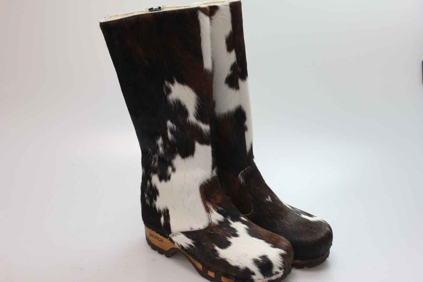 Bequemer Stiefel aus Rindfell, mit beweglicher Holzsohle. Die Innenseite ist echtem Schaffell verarbeitet. Schafthöhe 32 cm. Im Bild sehen Sie die Farbe Natur. Da es sich um gewachsenes Naturmaterial handelt, gleicht kein Paar dem anderen. Farbabweichungen vom Bild sind daher unumgänglich. Klicken Sie auf die Lupe um die anderen Perspektiven zu sehen.