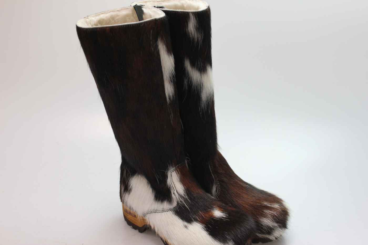 Bequemer Stiefel aus Rindfell, mit beweglicher Holzsohle. Die Innenseite ist echtem Schaffell verarbeitet. Schafthöhe 32 cm. Im Bild sehen Sie die Farbe Natur. Da es sich um gewachsenes Naturmaterial handelt, gleicht kein Paar dem anderen. Farbabweichungen vom Bild sind daher unumgänglich. Klicken Sie auf die Lupe um die anderen Perspektiven zu sehen.