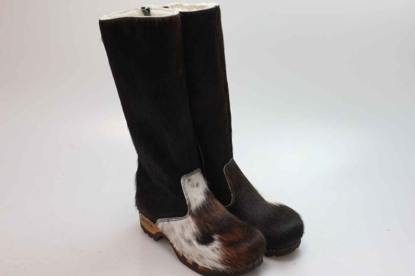 Bequemer Stiefel aus Rindfell, mit beweglicher Holzsohle. Die Innenseite ist echtem Schaffell verarbeitet. Schafthöhe 32 cm. Im Bild sehen Sie die Farbe Natur. Da es sich um gewachsenes Naturmaterial handelt, gleicht kein Paar dem anderen. Farbabweichungen vom Bild sind daher unumgänglich. Klicken Sie auf die Lupe um die anderen Perspektiven zu sehen.