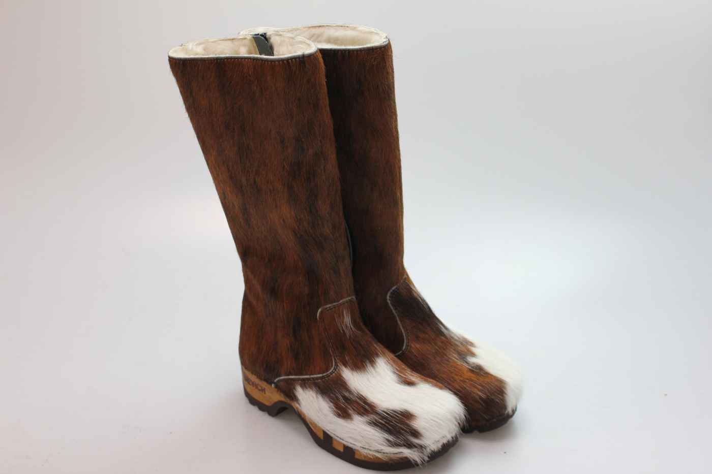 Bequemer Stiefel aus Rindfell, mit beweglicher Holzsohle. Die Innenseite ist echtem Schaffell verarbeitet. Schafthöhe 32 cm. Im Bild sehen Sie die Farbe Natur. Da es sich um gewachsenes Naturmaterial handelt, gleicht kein Paar dem anderen. Farbabweichungen vom Bild sind daher unumgänglich. Klicken Sie auf die Lupe um die anderen Perspektiven zu sehen.