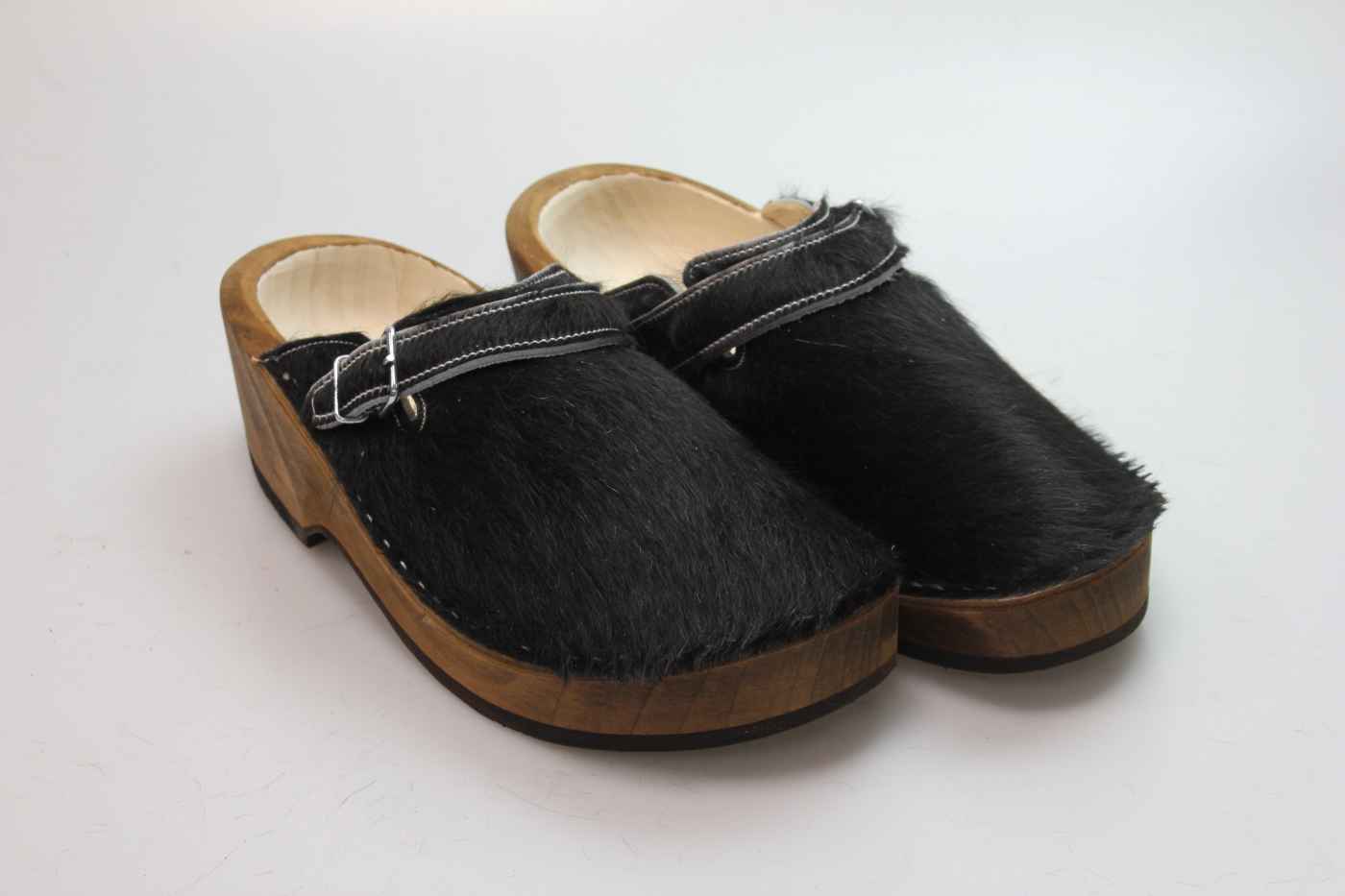 Dieser Holzschuh ist mittels einer Schnalle am Rist/Span verstellbar und ist mit einem Rindsleder gefüttert. Das Obermaterial ist echtes Rindfell. Im Bild sehen Sie das Unikat, welches Sie erhalten.