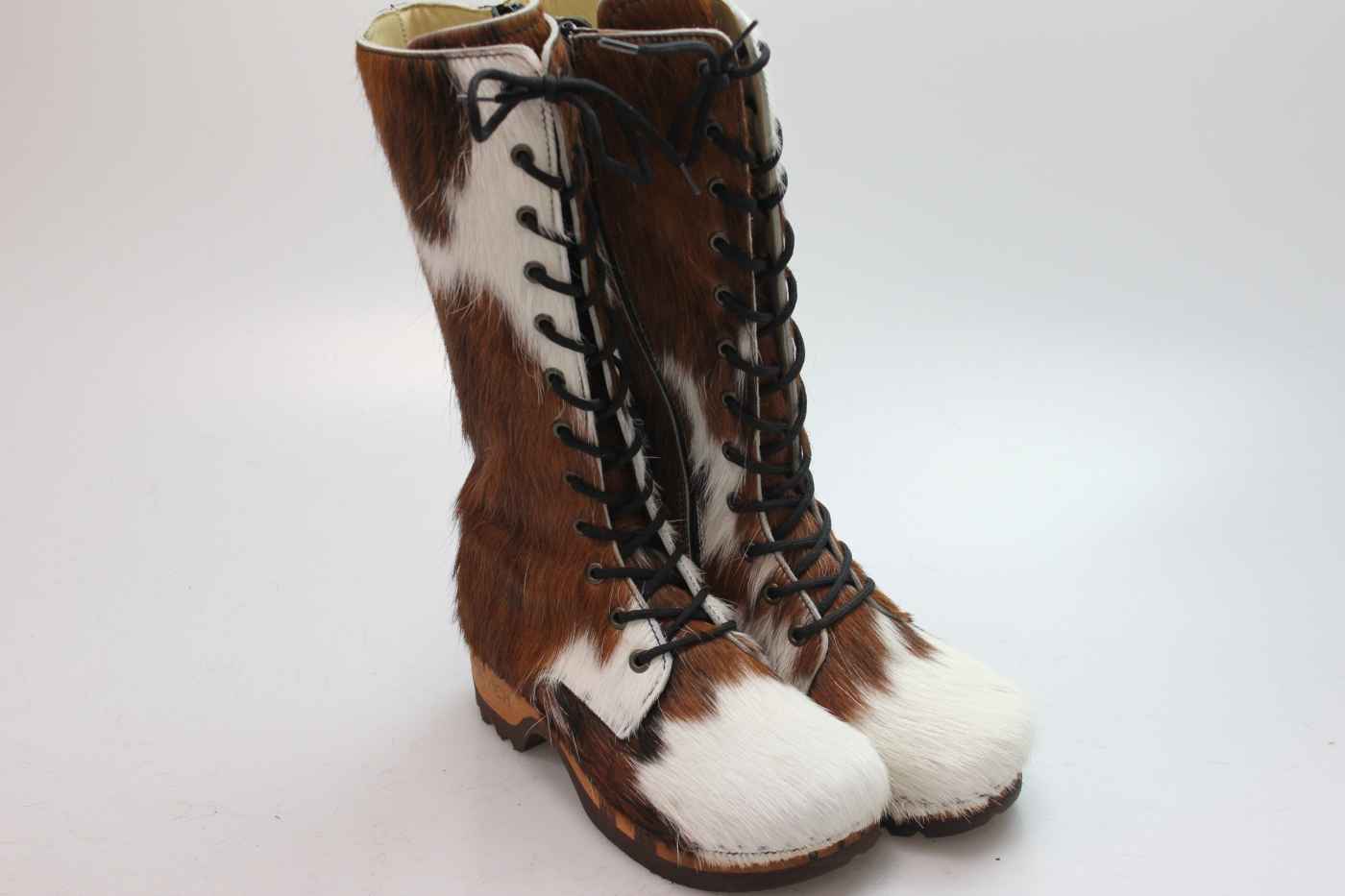 Bequemer Stiefel aus Rindfell, mit beweglicher Holzsohle. Die Innenseite ist mit hochwertigem, echtem Kalbsleder verarbeitet. Schafthöhe 32 cm. Die Weite kann an der Schnürung eingestellt werden und auf der Innenseite ist er mit einem Reißverschluss ausgestattet. Im Bild sehen Sie genau das Paar, das Sie erhalten.