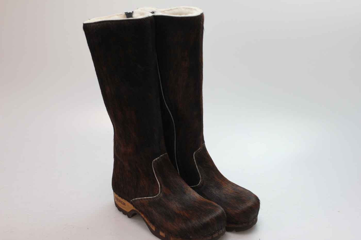 Bequemer Stiefel aus Rindfell, mit beweglicher Holzsohle. Die Innenseite ist echtem Schaffell verarbeitet. Schafthöhe 32 cm. Im Bild sehen Sie die Farbe Natur. Da es sich um gewachsenes Naturmaterial handelt, gleicht kein Paar dem anderen. Farbabweichungen vom Bild sind daher unumgänglich. Klicken Sie auf die Lupe um die anderen Perspektiven zu sehen.