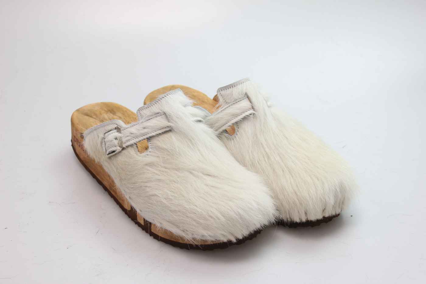 Das Obermaterial ist aus echtem Rindfell und in verschiedenen Farben erhältlich. Durch die Schnalle am Rist/Spann kann er dem Fuß angepasst werden. Im Bild sehen Sie das Exemplar, das Sie erhalten.