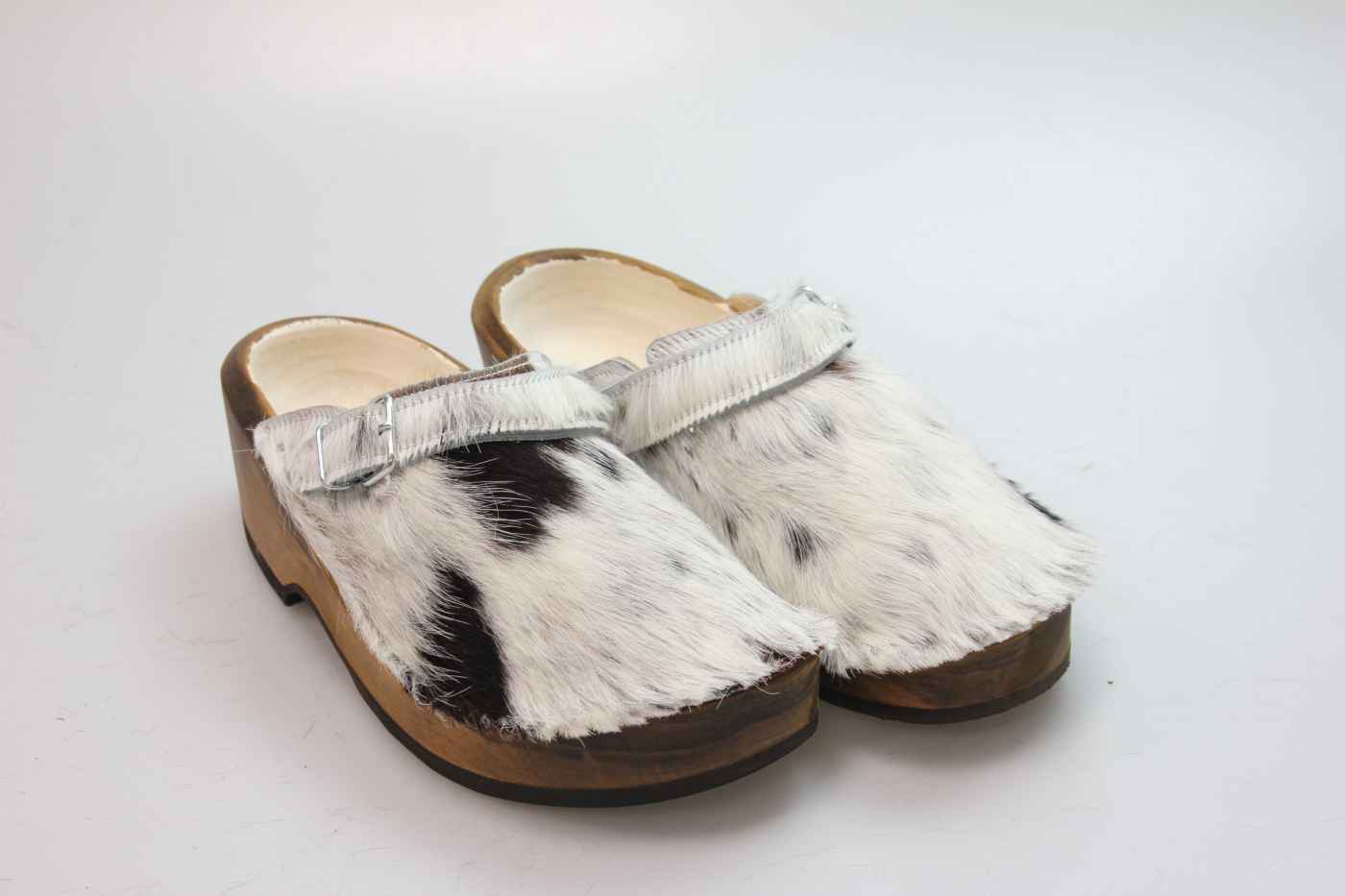 Dieser Holzschuh ist mittels einer Schnalle am Rist/Span verstellbar und ist mit einem Rindsleder gefüttert. Das Obermaterial ist echtes Rindfell. Im Bild sehen Sie das Unikat, welches Sie erhalten.