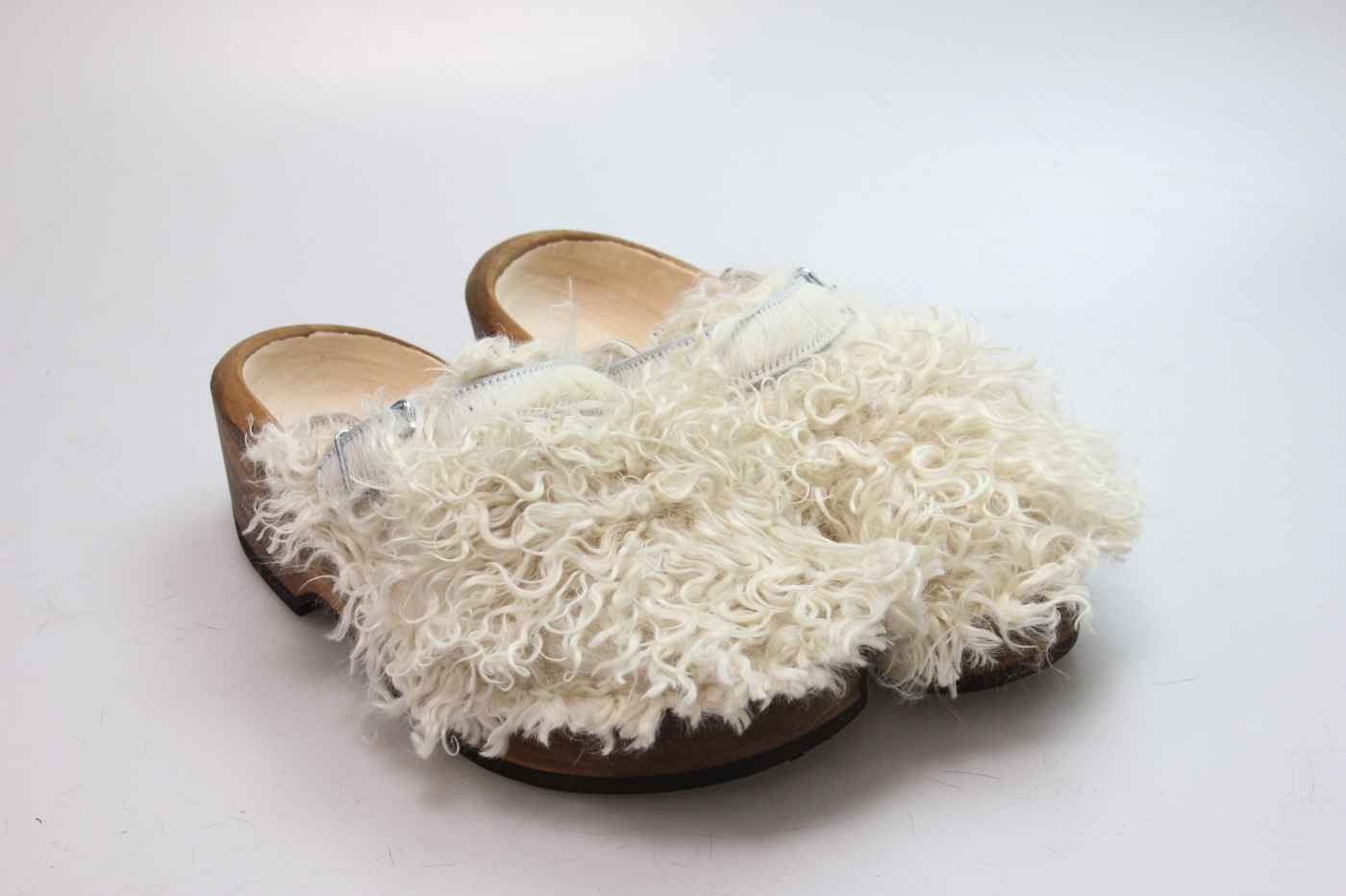 Der Holzschuh, mit dem Sie sicherlich auffallen werden. Außen verwenden wir für dieses Modell Ziegenfell. Für zusätzichen Komfort ist er auch mit Schaffell gefüttert. Im Bild sehen Sie das Unikat, welches Sie erhalten.
