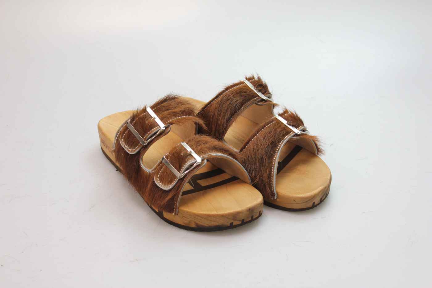 Holzsohle mit eingearbeitetem Fußbett. Die Laufsohle ist aus rutschfestem und abriebfestem PU. Durch die bewegliche Holzsohle ist die Sandale weich und leise beim Auftreten. Mittels zwei Schnallen kann sie dem Fuß perfekt angepasst werden.