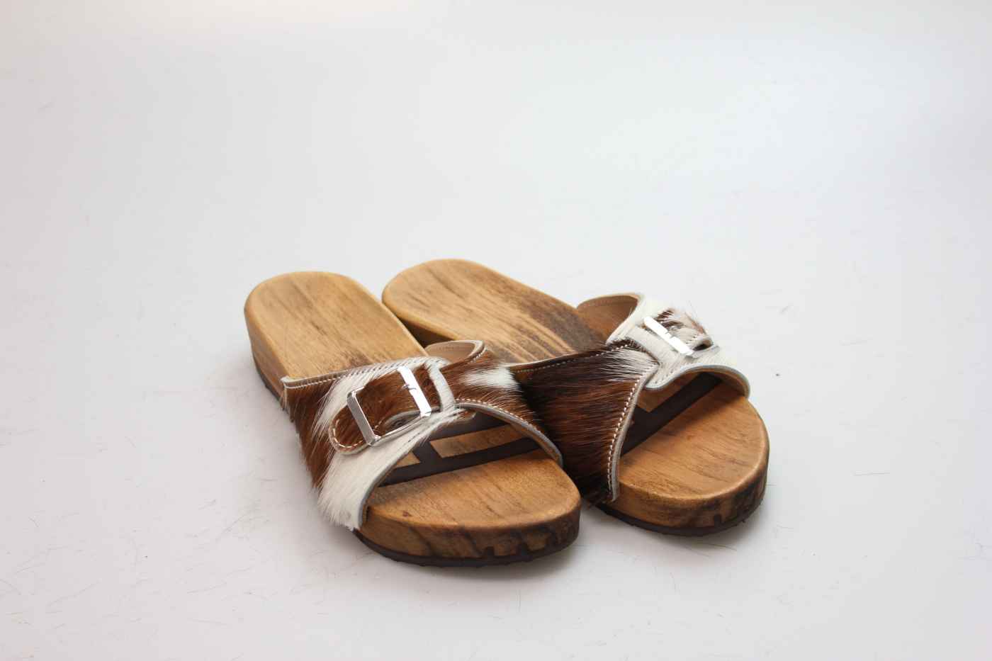 2-fach flexible Holzsohle. Obermaterial aus echtem Rindsfell, mit einem verstellbaren Riemen.
