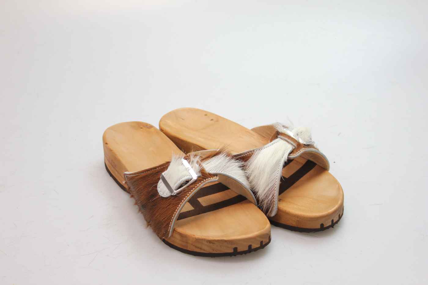 2-fach flexible Holzsohle. Obermaterial aus echtem Rindsfell, mit einem verstellbaren Riemen.