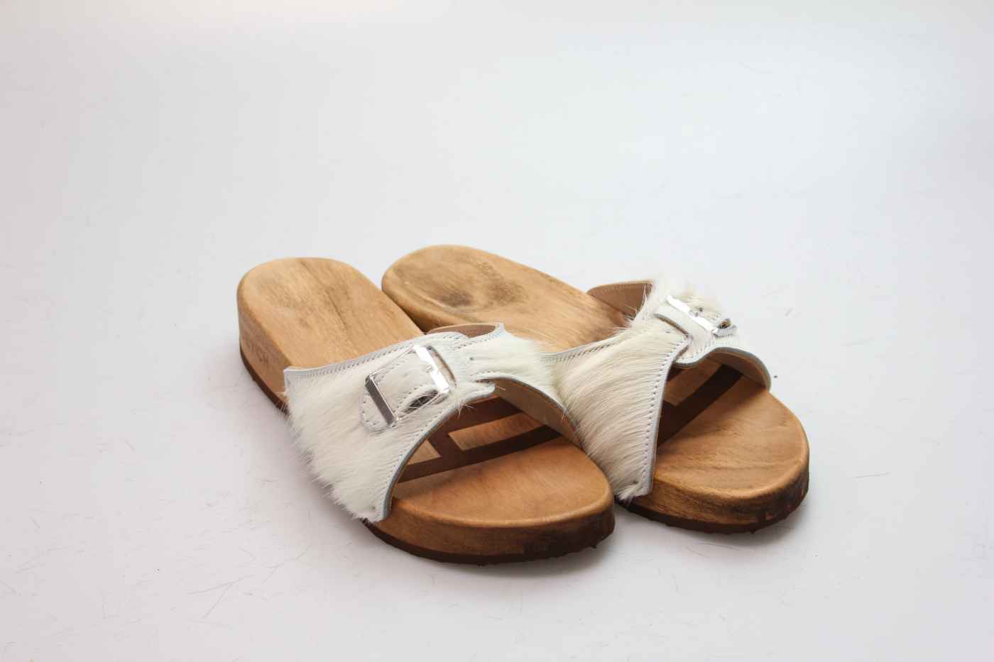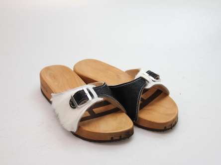 2-fach flexible Holzsohle. Obermaterial aus echtem Rindsfell, mit einem verstellbaren Riemen.