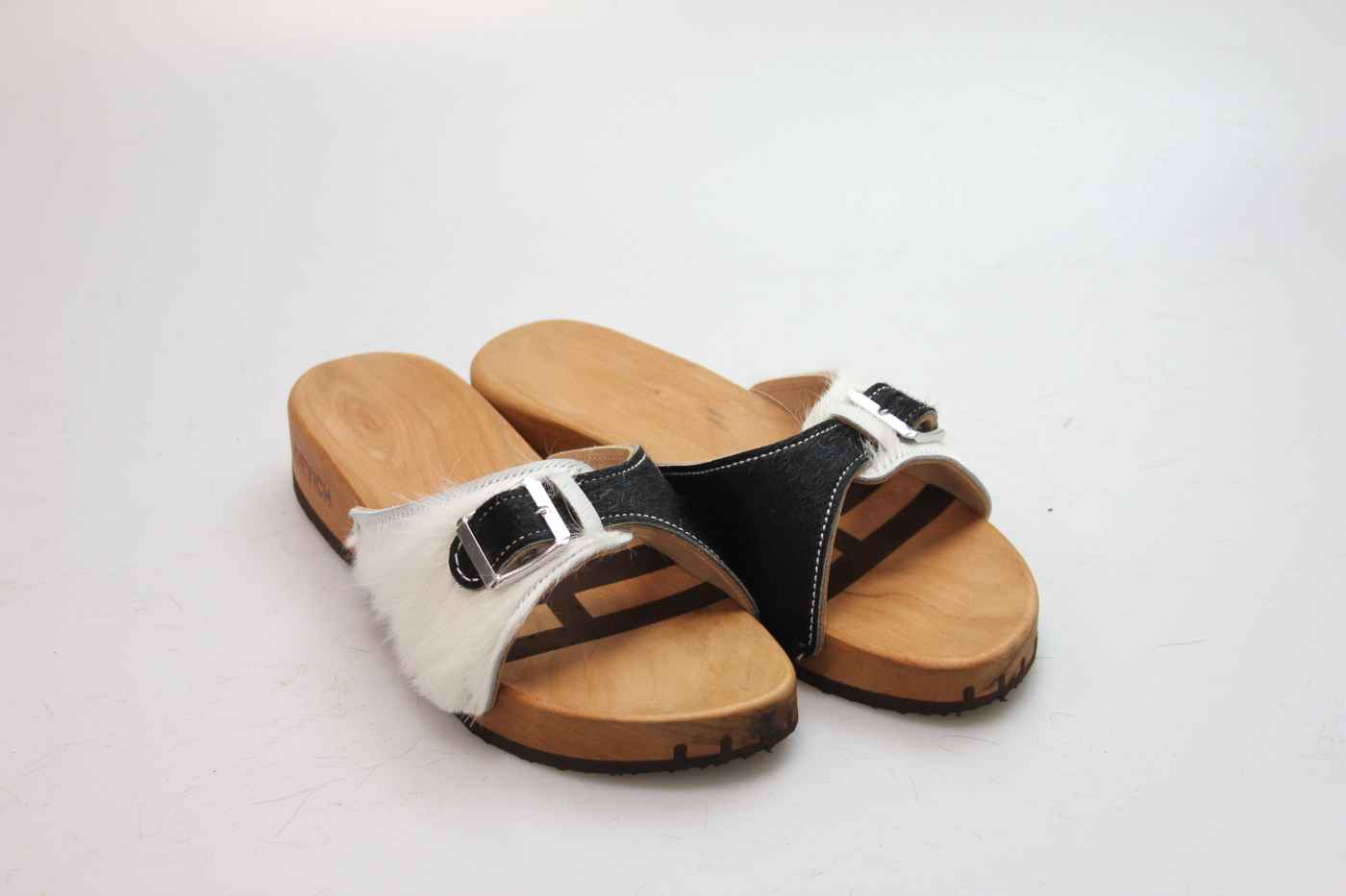 2-fach flexible Holzsohle. Obermaterial aus echtem Rindsfell, mit einem verstellbaren Riemen.