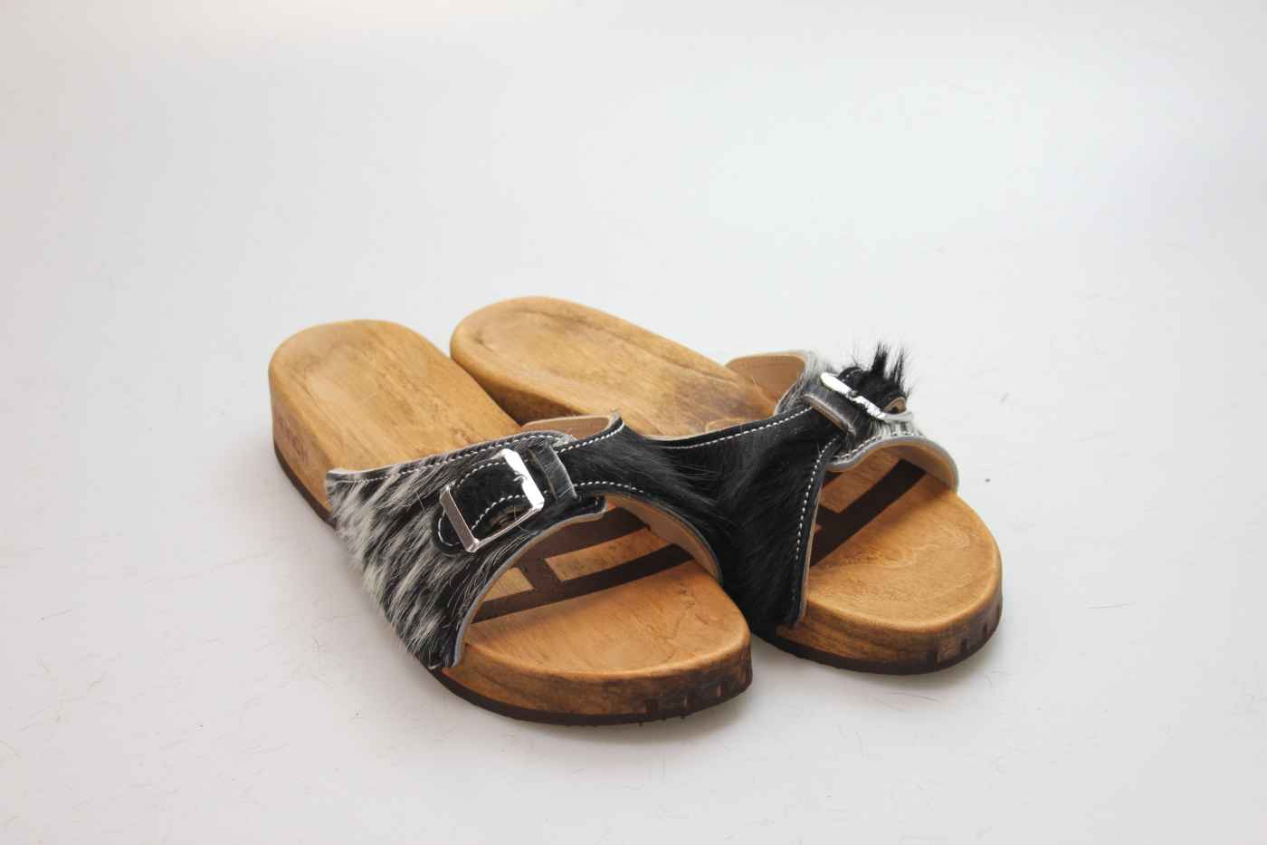 2-fach flexible Holzsohle. Obermaterial aus echtem Rindsfell, mit einem verstellbaren Riemen.