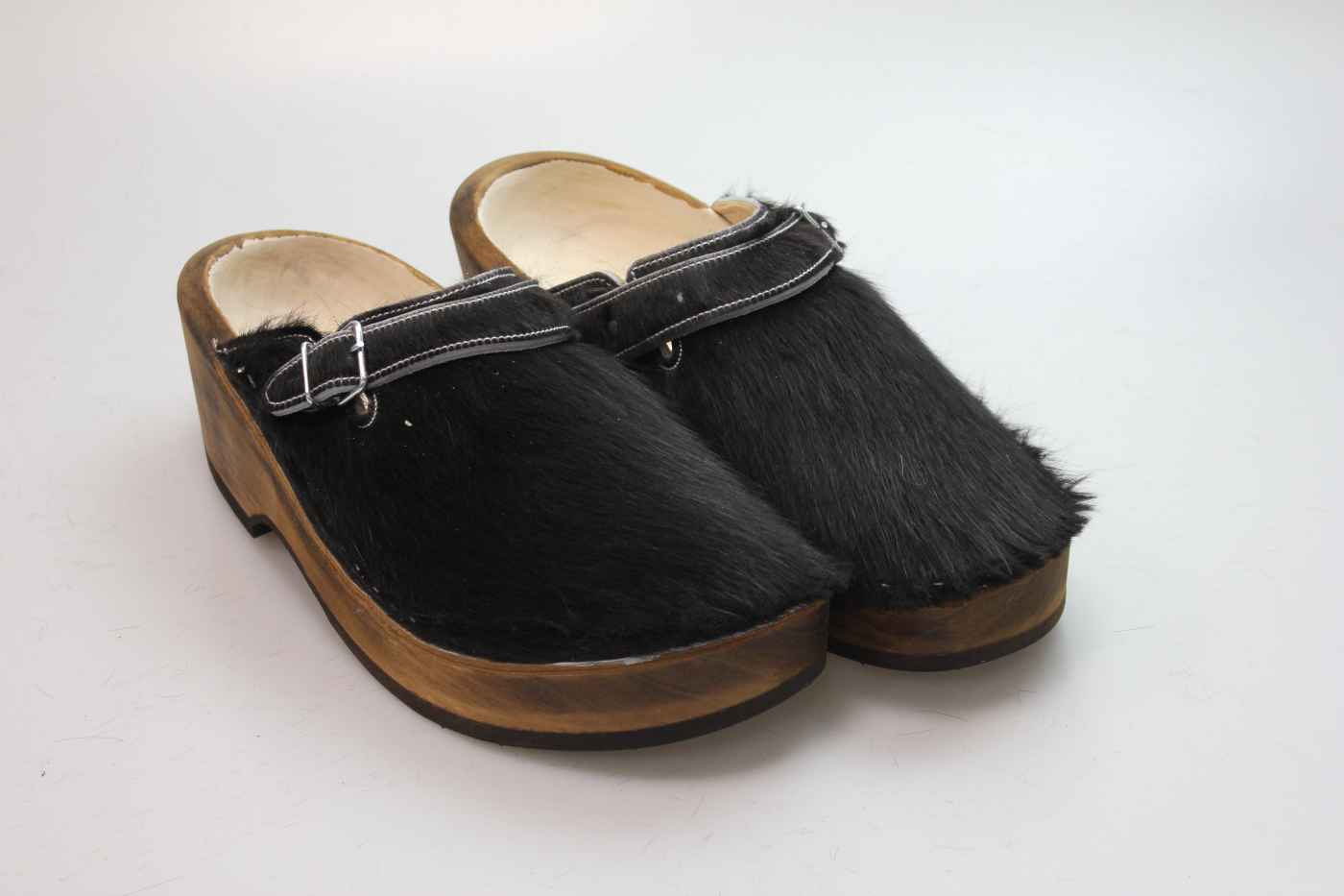 Dieser Holzschuh ist mittels einer Schnalle am Rist/Span verstellbar und ist mit einem Rindsleder gefüttert. Das Obermaterial ist echtes Rindfell. Im Bild sehen Sie das Unikat, welches Sie erhalten.