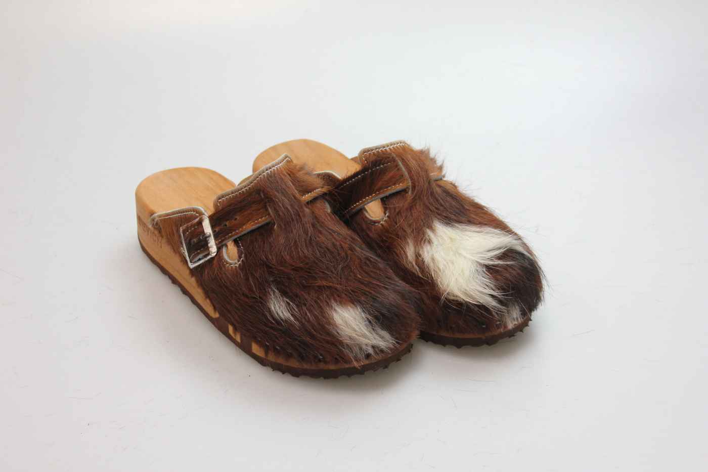 Das Obermaterial ist aus echtem Rindfell und in verschiedenen Farben erhältlich. Durch die Schnalle am Rist/Spann kann er dem Fuß angepasst werden. Im Bild sehen Sie das Exemplar, das Sie erhalten.