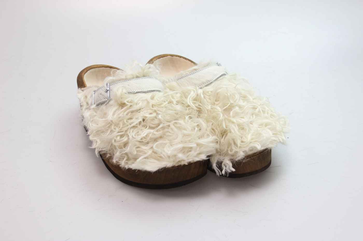Der Holzschuh, mit dem Sie sicherlich auffallen werden. Außen verwenden wir für dieses Modell Ziegenfell. Für zusätzichen Komfort ist er auch mit Schaffell gefüttert. Im Bild sehen Sie das Unikat, welches Sie erhalten.