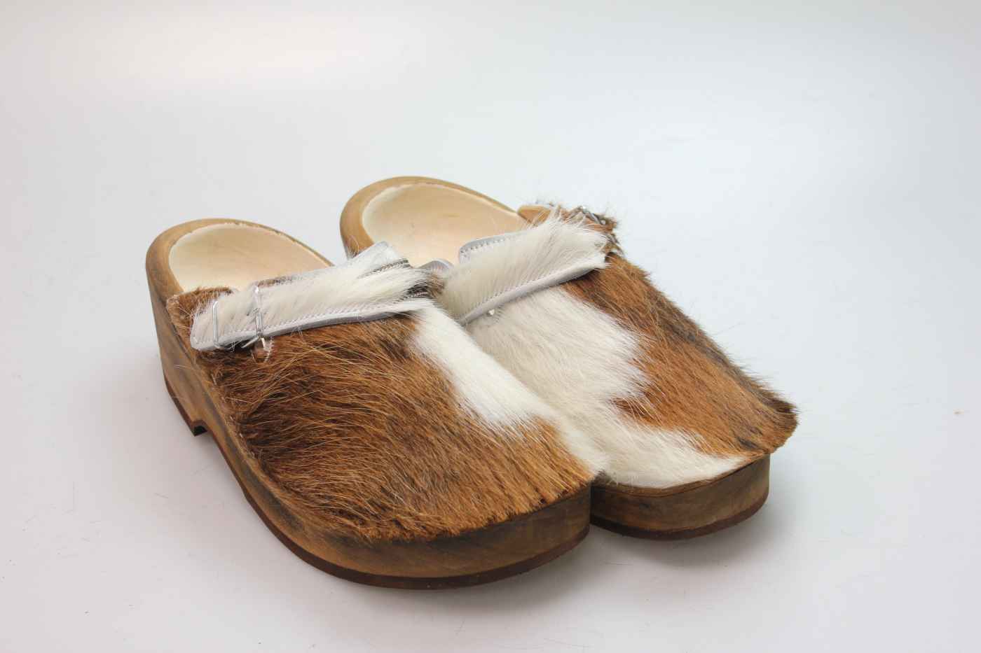 Dieser Holzschuh ist mittels einer Schnalle am Rist/Span verstellbar und ist mit einem Rindsleder gefüttert. Das Obermaterial ist echtes Rindfell. Im Bild sehen Sie das Unikat, welches Sie erhalten.