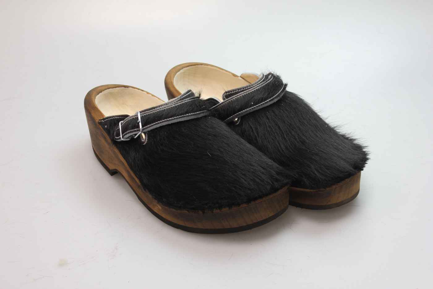 Dieser Holzschuh ist mittels einer Schnalle am Rist/Span verstellbar und ist mit einem Rindsleder gefüttert. Das Obermaterial ist echtes Rindfell. Im Bild sehen Sie das Unikat, welches Sie erhalten.