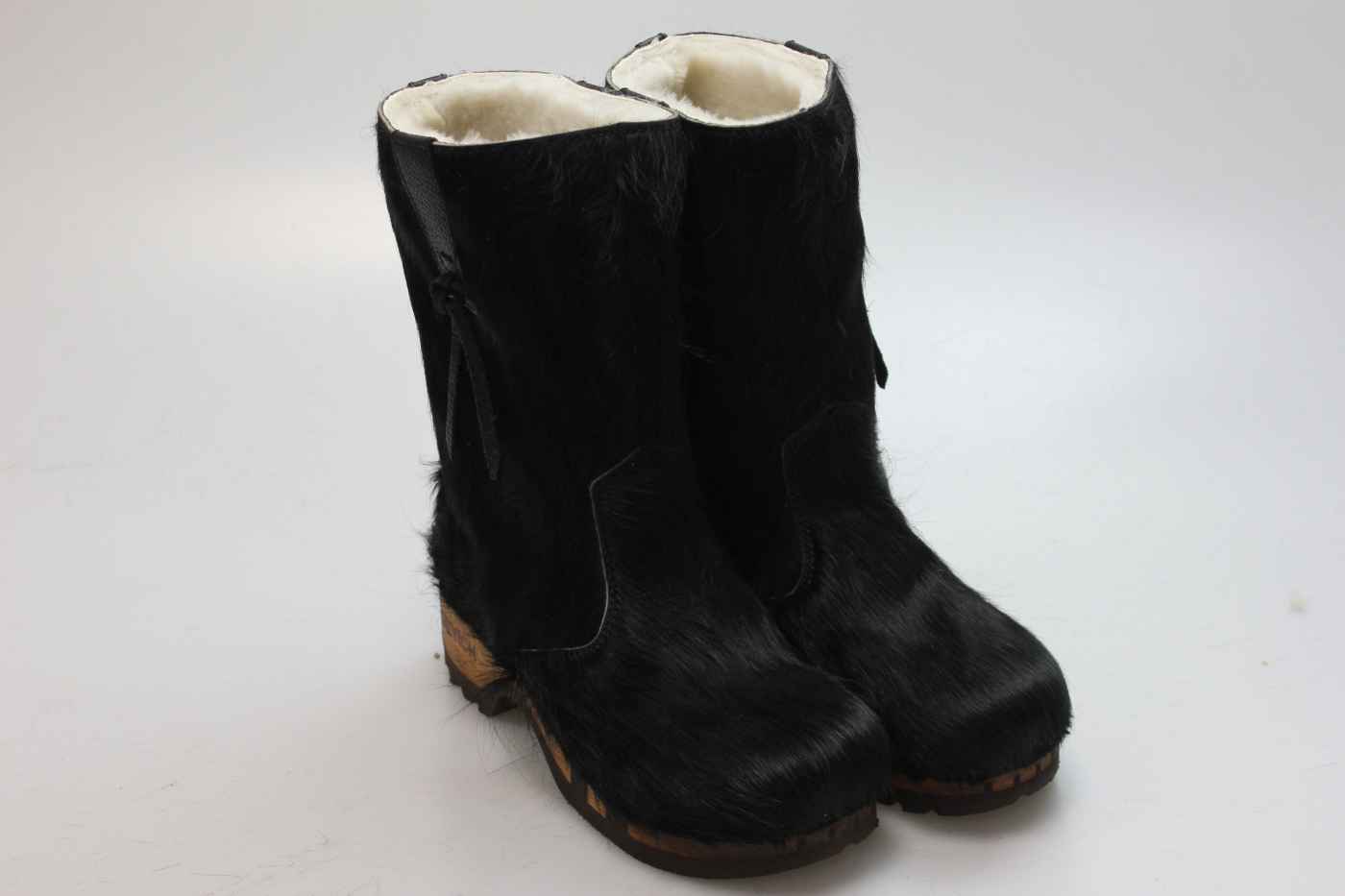 Bequemer Schlüpfstiefel aus Rindfell, mit beweglicher Holzsohle. Die Innenseite ist mit hochwertigem, echtem Schaffell verarbeitet.