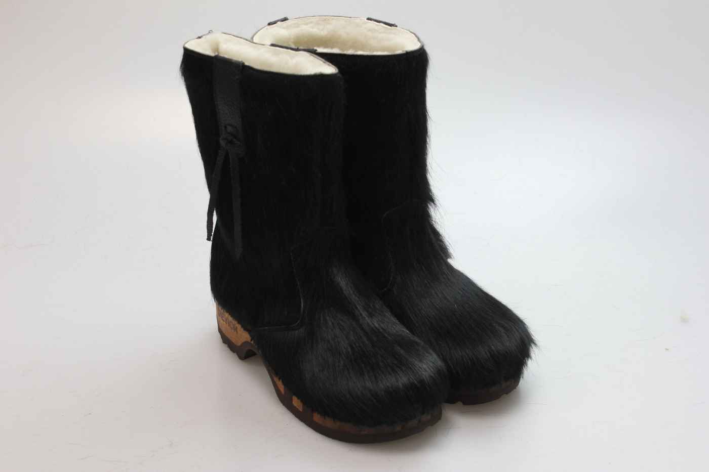 Bequemer Schlüpfstiefel aus Rindfell, mit beweglicher Holzsohle. Die Innenseite ist mit hochwertigem, echtem Schaffell verarbeitet.