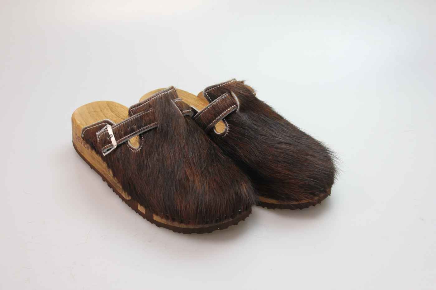 Das Obermaterial ist aus echtem Rindfell und in verschiedenen Farben erhältlich. Durch die Schnalle am Rist/Spann kann er dem Fuß angepasst werden. Im Bild sehen Sie das Exemplar, das Sie erhalten.