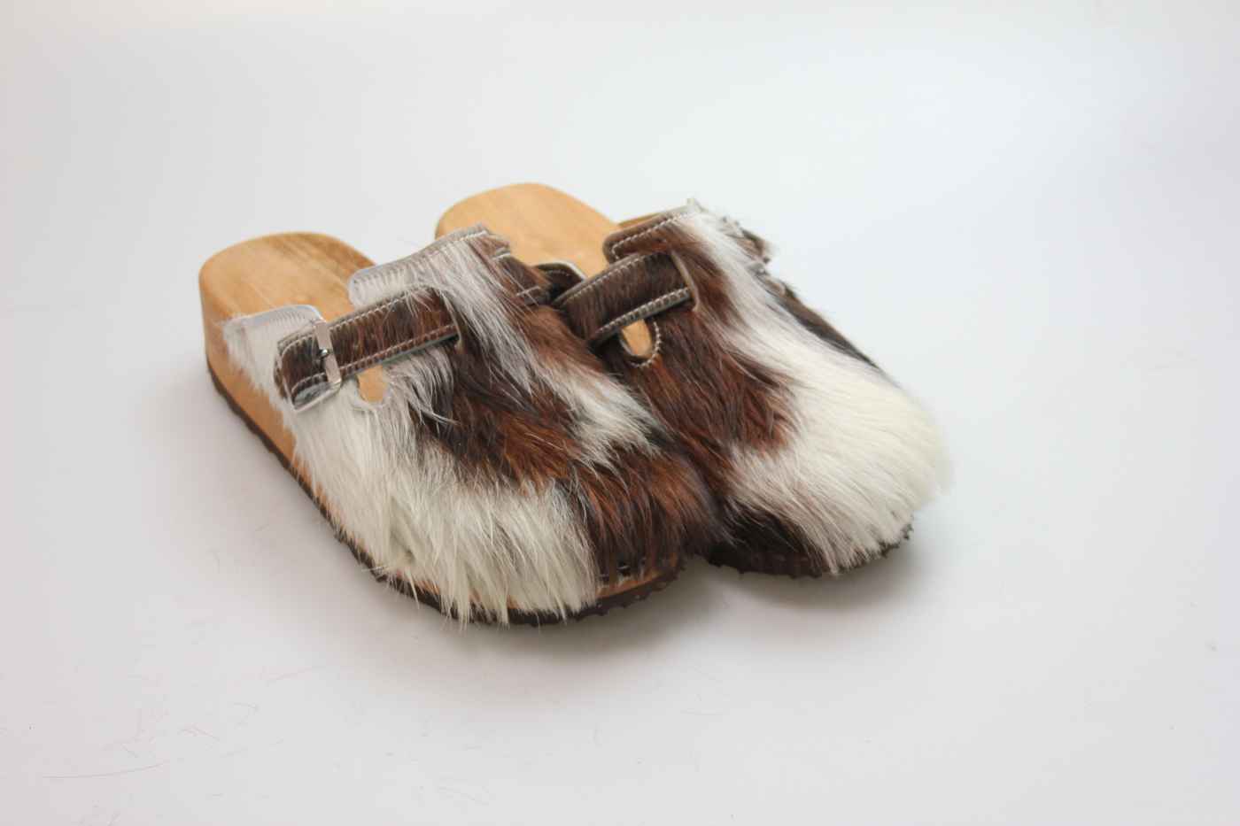 Das Obermaterial ist aus echtem Rindfell und in verschiedenen Farben erhältlich. Durch die Schnalle am Rist/Spann kann er dem Fuß angepasst werden.
