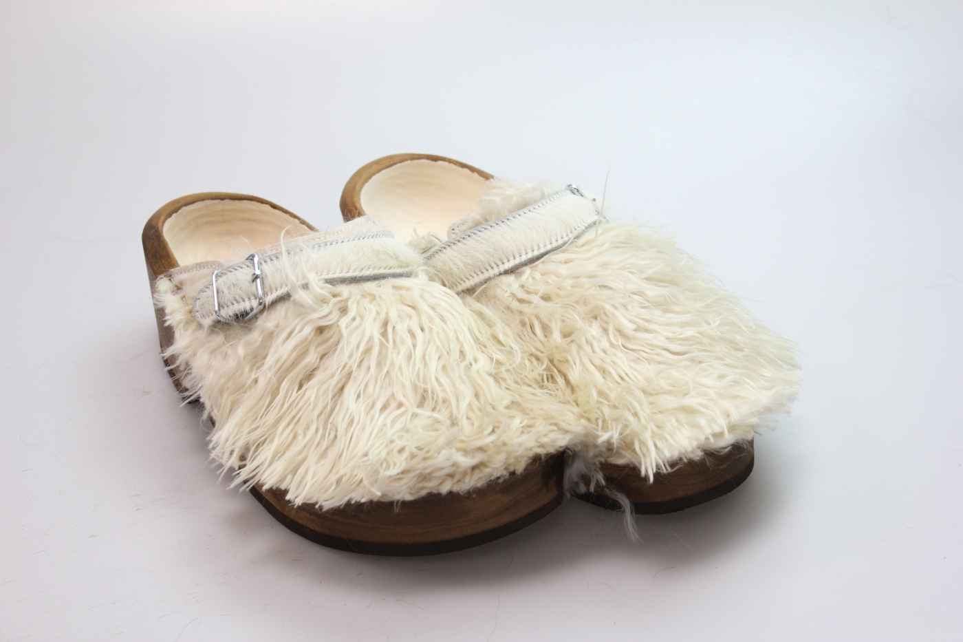 Der Holzschuh, mit dem Sie sicherlich auffallen werden. Außen verwenden wir für dieses Modell Ziegenfell. Für zusätzichen Komfort ist er auch mit Schaffell gefüttert. Im Bild sehen Sie das Unikat, welches Sie erhalten.