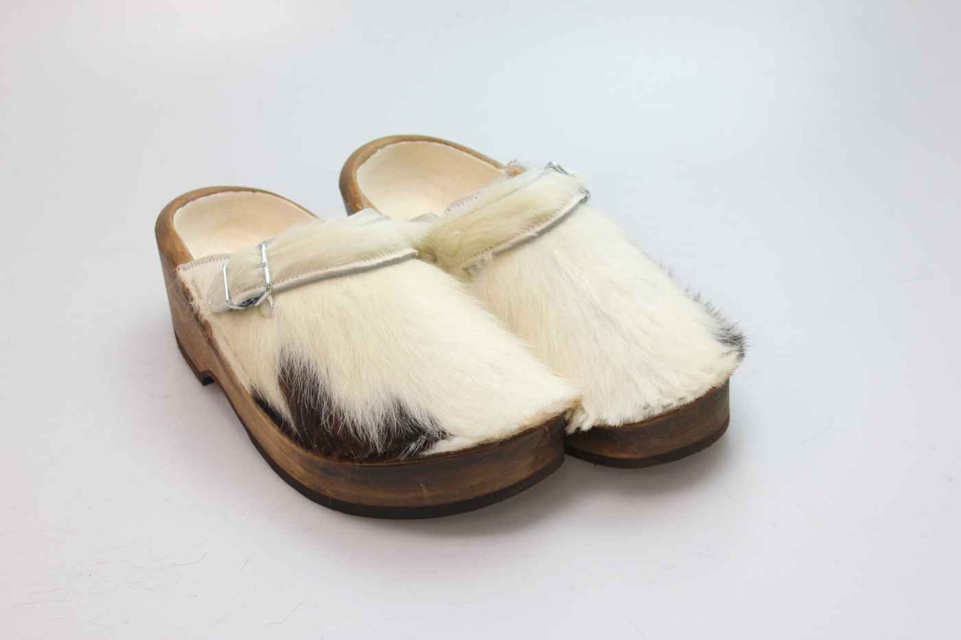 Dieser Holzschuh ist mittels einer Schnalle am Rist/Span verstellbar und ist mit einem Rindsleder gefüttert. Das Obermaterial ist echtes Rindfell. Im Bild sehen Sie das Unikat, welches Sie erhalten.