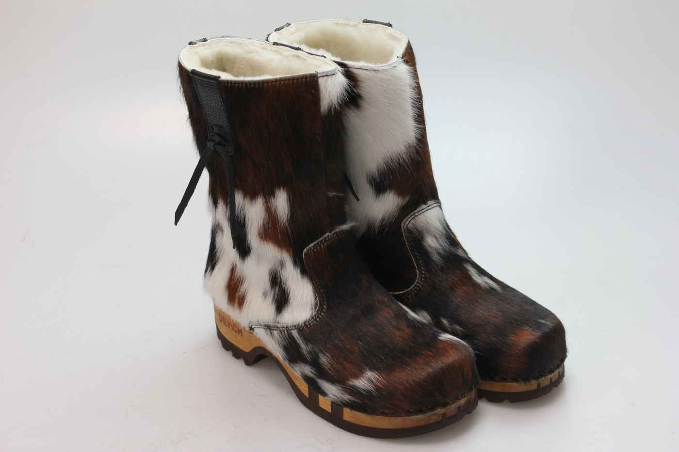 Bequemer Schlüpfstiefel aus Rindfell, mit beweglicher Holzsohle. Die Innenseite ist mit hochwertigem, echtem Schaffell verarbeitet.