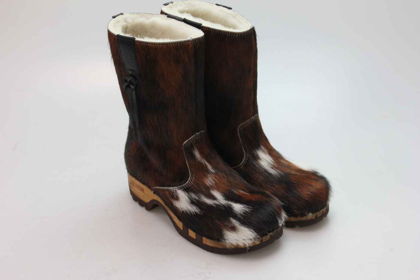Bequemer Schlüpfstiefel aus Rindfell, mit beweglicher Holzsohle. Die Innenseite ist mit hochwertigem, echtem Schaffell verarbeitet.