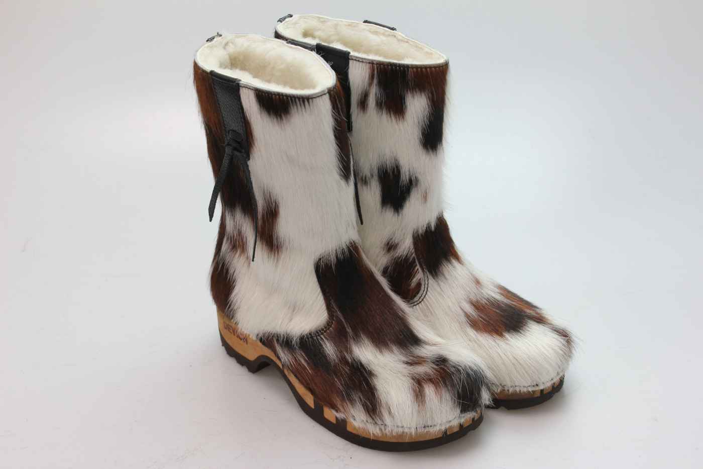Bequemer Schlüpfstiefel aus Rindfell, mit beweglicher Holzsohle. Die Innenseite ist mit hochwertigem, echtem Schaffell verarbeitet.