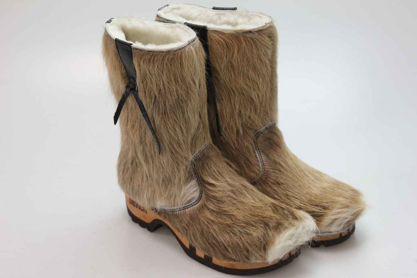 Bequemer Schlüpfstiefel aus Rindfell, mit beweglicher Holzsohle. Die Innenseite ist mit hochwertigem, echtem Schaffell verarbeitet.