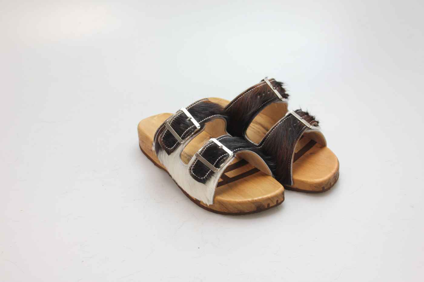 Holzsohle mit eingearbeitetem Fußbett. Die Laufsohle ist aus rutschfestem und abriebfestem PU. Durch die bewegliche Holzsohle ist die Sandale weich und leise beim Auftreten. Mittels zwei Schnallen kann sie dem Fuß perfekt angepasst werden.