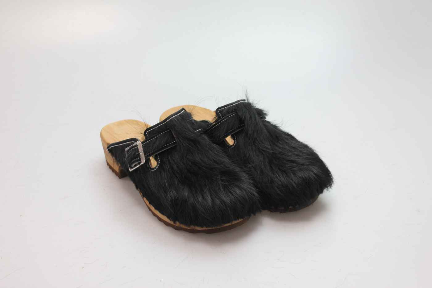 Die Holzsohle ist aus Pappelholz mit eingearbeitetem Fußbett und abriebfester Laufsohle. Das Oberleder ist aus echtem Rindfell. Durch die Schnalle am Rist/Spann kann er dem Fuß angepasst werden.