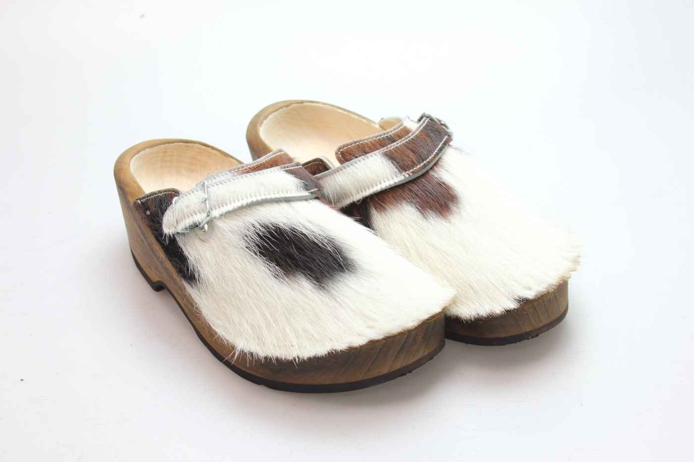Dieser Holzschuh ist mittels einer Schnalle am Rist/Span verstellbar und ist mit einem Rindsleder gefüttert. Das Obermaterial ist echtes Rindfell. Im Bild sehen Sie das Unikat, welches Sie erhalten.