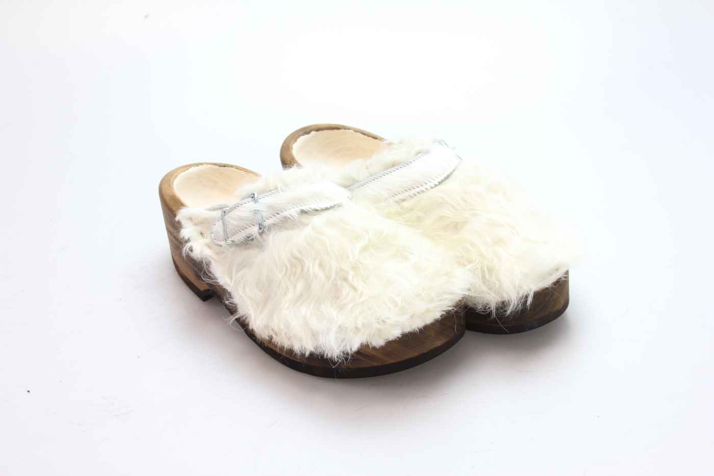 Der Holzschuh, mit dem Sie sicherlich auffallen werden. Außen verwenden wir für dieses Modell Ziegenfell. Für zusätzichen Komfort ist er auch mit Schaffell gefüttert. Im Bild sehen Sie das Unikat, welches Sie erhalten.