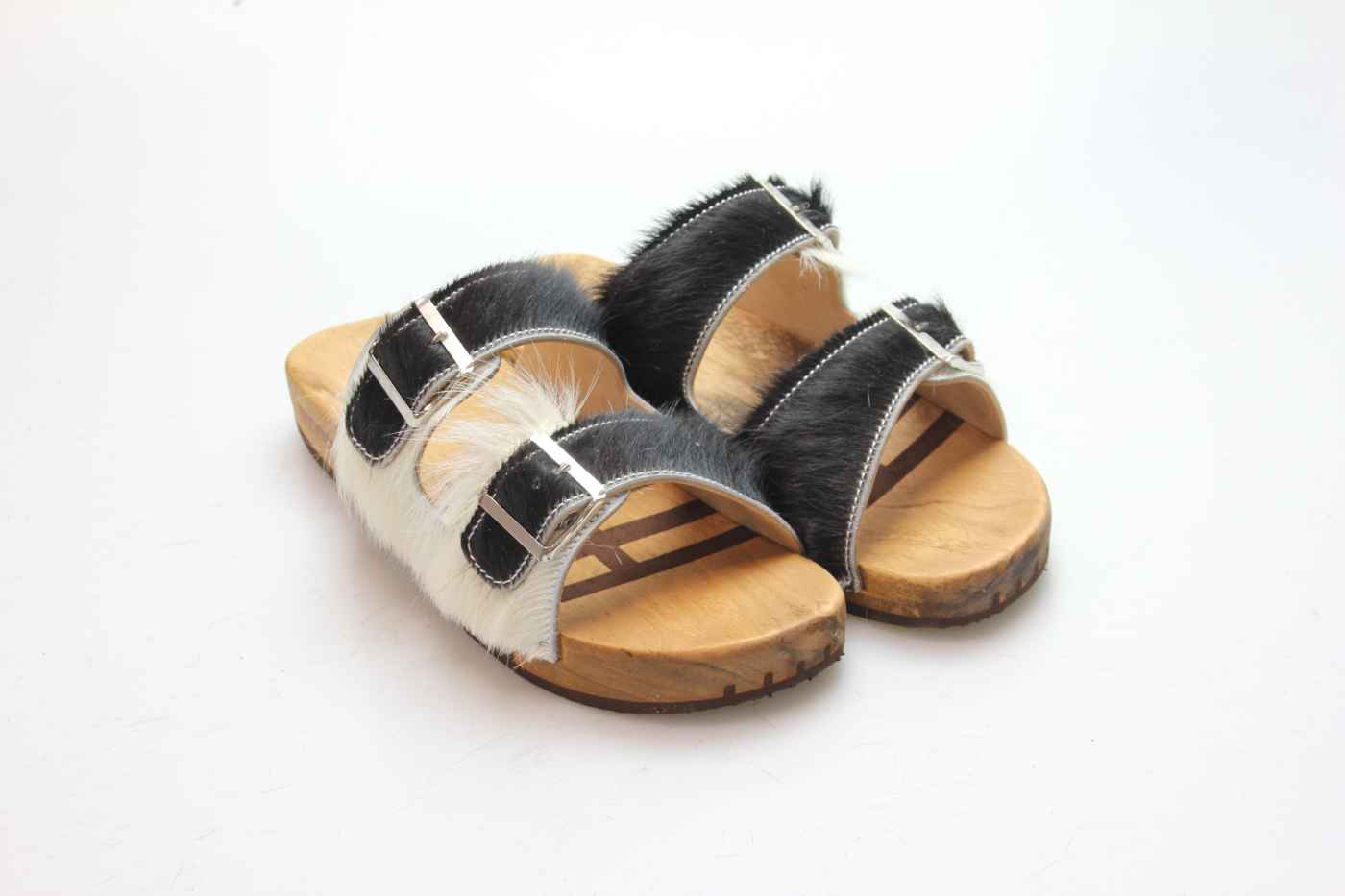 Holzsohle mit eingearbeitetem Fußbett. Die Laufsohle ist aus rutschfestem und abriebfestem PU. Durch die bewegliche Holzsohle ist die Sandale weich und leise beim Auftreten. Mittels zwei Schnallen kann sie dem Fuß perfekt angepasst werden.