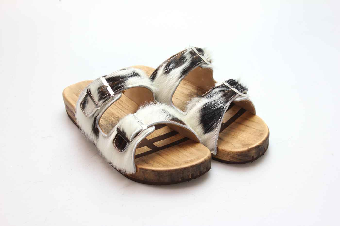 Holzsohle mit eingearbeitetem Fußbett. Die Laufsohle ist aus rutschfestem und abriebfestem PU. Durch die bewegliche Holzsohle ist die Sandale weich und leise beim Auftreten. Mittels zwei Schnallen kann sie dem Fuß perfekt angepasst werden.