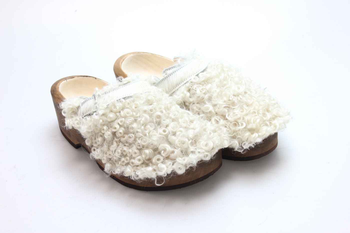 Der Holzschuh, mit dem Sie sicherlich auffallen werden. Außen verwenden wir für dieses Modell Ziegenfell. Für zusätzichen Komfort ist er auch mit Schaffell gefüttert. Im Bild sehen Sie das Unikat, welches Sie erhalten.