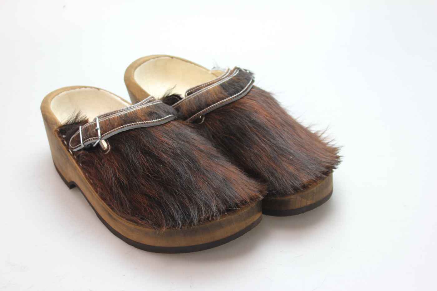 Dieser Holzschuh ist mittels einer Schnalle am Rist/Span verstellbar und ist mit einem Rindsleder gefüttert. Das Obermaterial ist echtes Rindfell. Im Bild sehen Sie das Unikat, welches Sie erhalten.