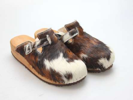 Das Obermaterial ist aus echtem Rindfell und in verschiedenen Farben erhältlich. Durch die Schnalle am Rist/Spann kann er dem Fuß angepasst werden. Im Bild sehen Sie das Exemplar, das Sie erhalten.