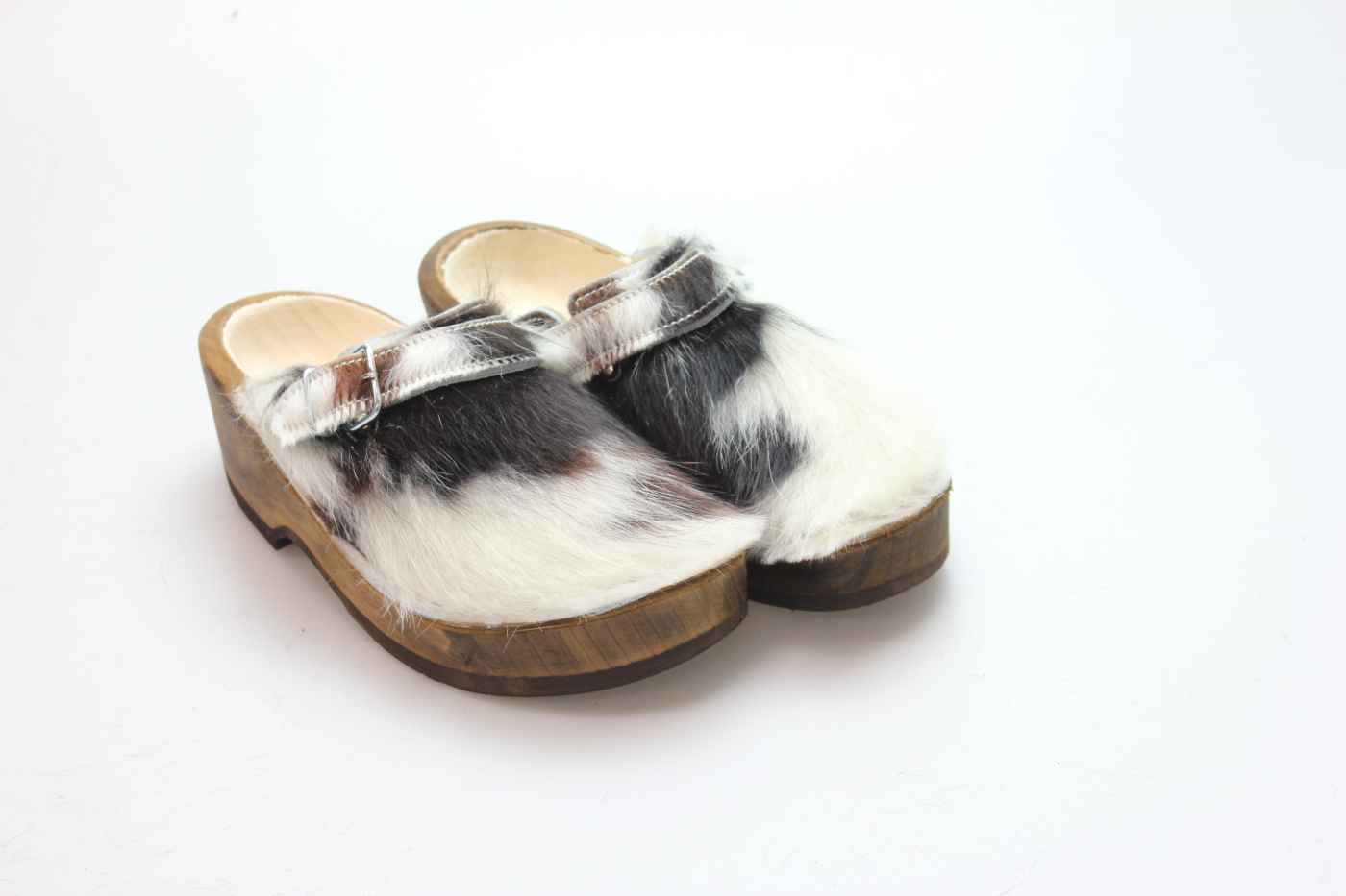 Dieser Holzschuh ist mittels einer Schnalle am Rist/Span verstellbar und ist mit einem Rindsleder gefüttert. Das Obermaterial ist echtes Rindfell. Im Bild sehen Sie das Unikat, welches Sie erhalten.